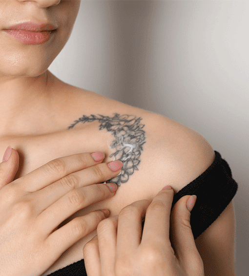 Une fois le tatouage terminé, votre tatoueuse applique un pansement ainsi qu’une crème épaisse sur la peau avant de vous conseiller une pommade pour les jours suivants, permettant ainsi la cicatrisation !